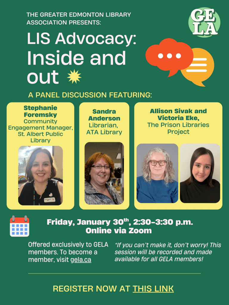 We would like to invite our GELA members to attend our virtual panel discussion on Friday, January 30th from 2:30 to 3:30 p.m. MST on “LIS Advocacy: Inside and Out.” Our panelists joining us for this conversation are: