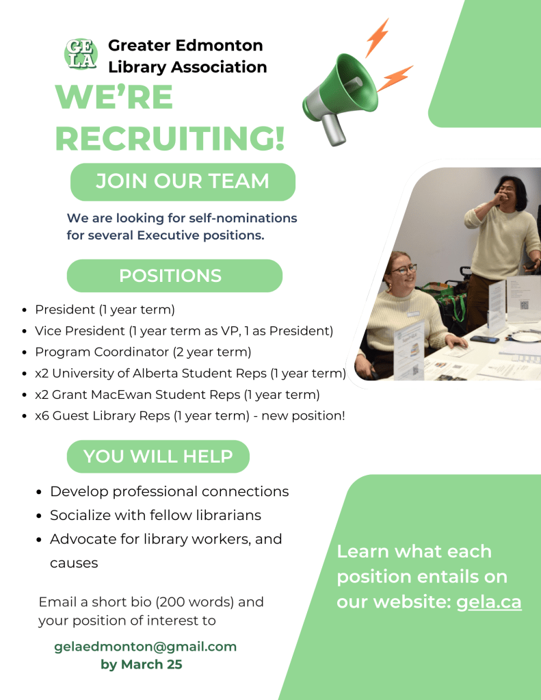 We are also looking for library and archive workers from across the greater Edmonton area to act as guest representatives. In this position, you shall be responsible for liaison between your colleagues and the Association, as well assist in coordinating events and activities. No matter which library workplace or system you work in, we wish to hear from you!