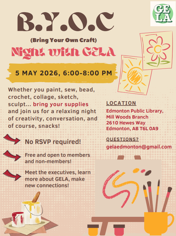 This event is on Tuesday, May 5th, from 6:00 until 8:00 p.m. at the Mill Woods Branch of the Edmonton Public Library (2610 Hewes Way Edmonton, Alberta, T6L 0A9). Stop by for a bit, or stay the whole time!